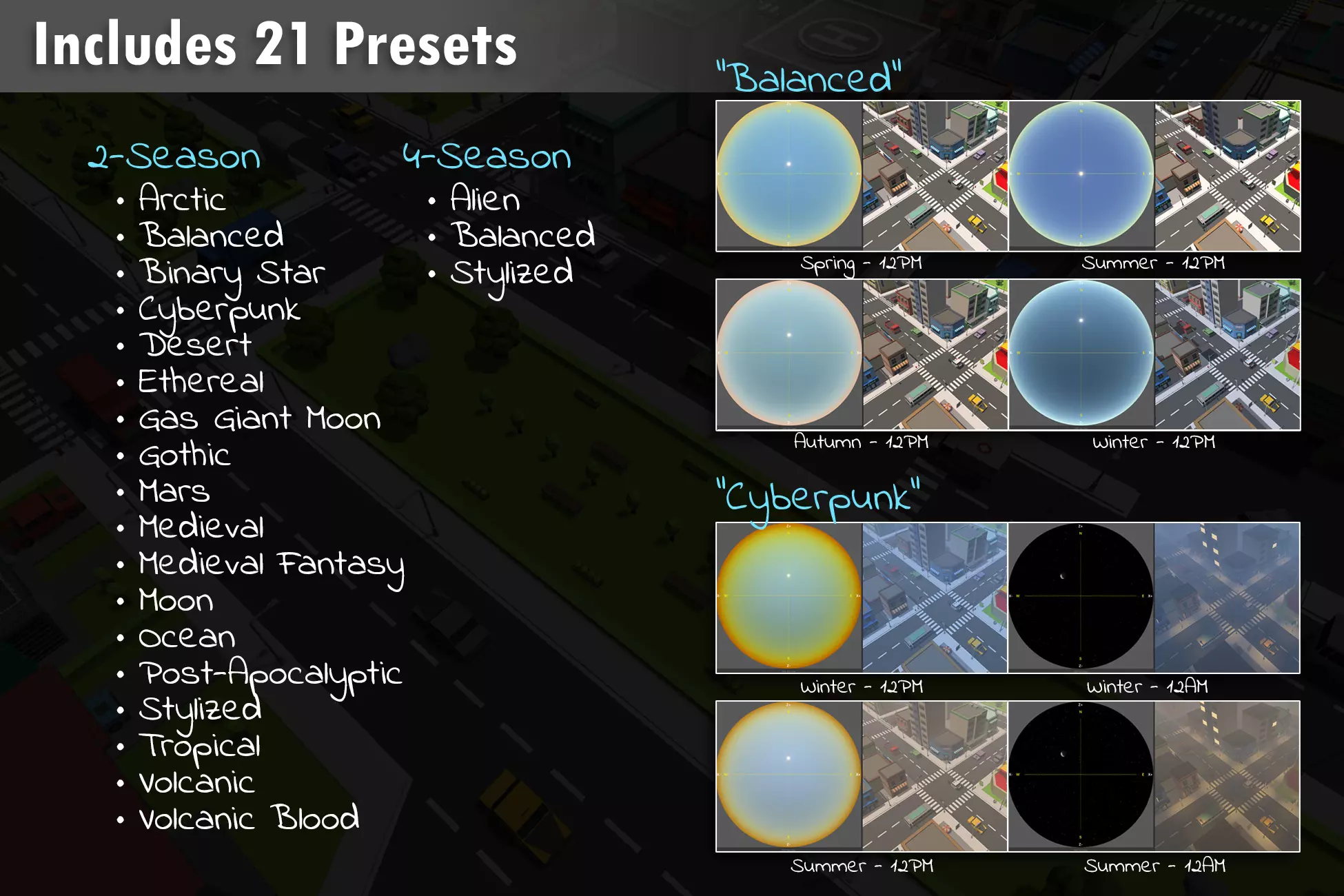 The package ships with 21 prebuilt seasonal lighting profiles, covering a range of visual styles such as realistic, fantasy, arctic, and alien environments. These presets are meant as starting points rather than fixed solutions.