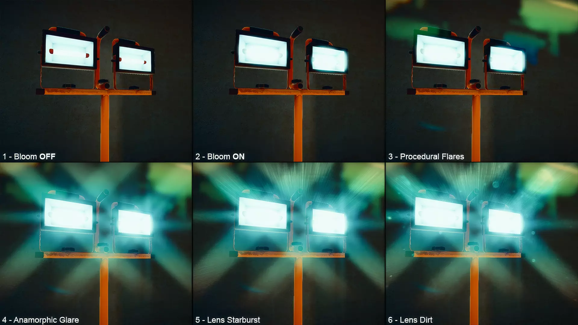 Beyond bloom, the package includes additional lens-style effects that can be enabled independently.