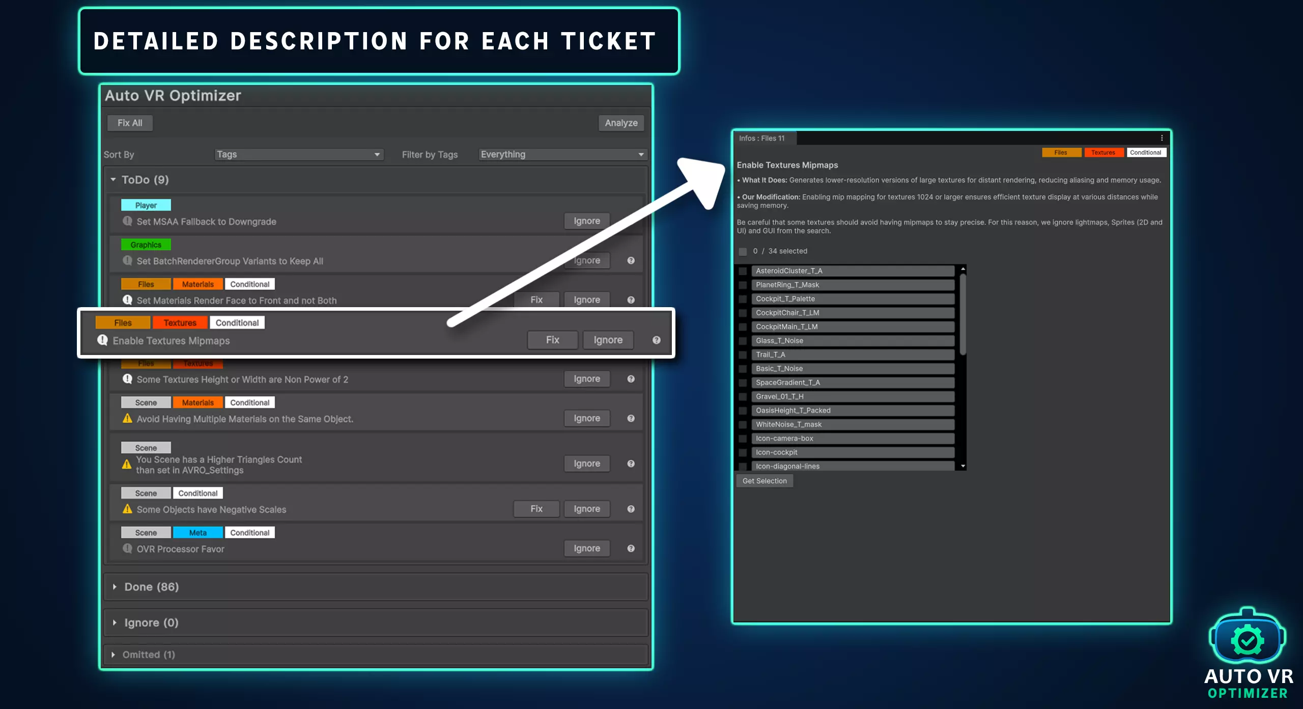 Auto VR Optimizer scans your Unity project and generates a checklist of optimization ‘tickets’. Each ticket highlights a potential performance issue or area for improvement, with clear options to fix them. You can review them individually or apply most changes in just one click.