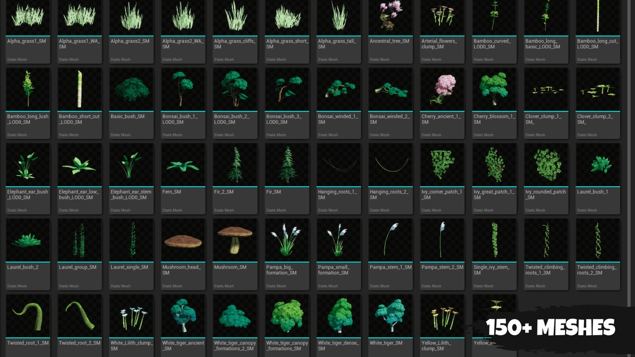 Juan “All Trades Jack” Vega. This Unreal Engine asset collection has over 150 semi-stylized, Asia-inspired elements, such as trees, rocks, grass, flowers, and many other things.