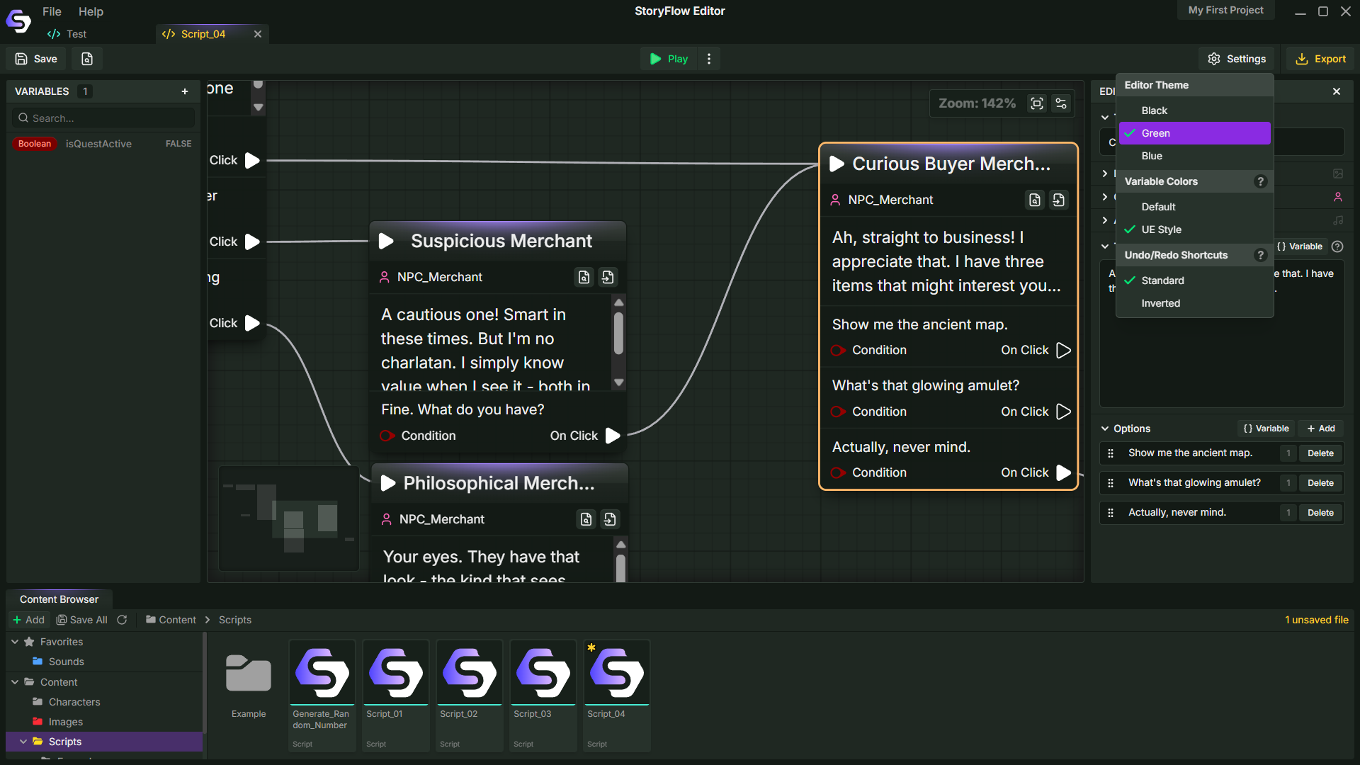 The structure of the story is defined visually, so it’s easier to follow how different paths connect and where decisions lead. The system includes over 80 node types, covering everything from basic branching to more complex logic using variables, arrays, and enums.