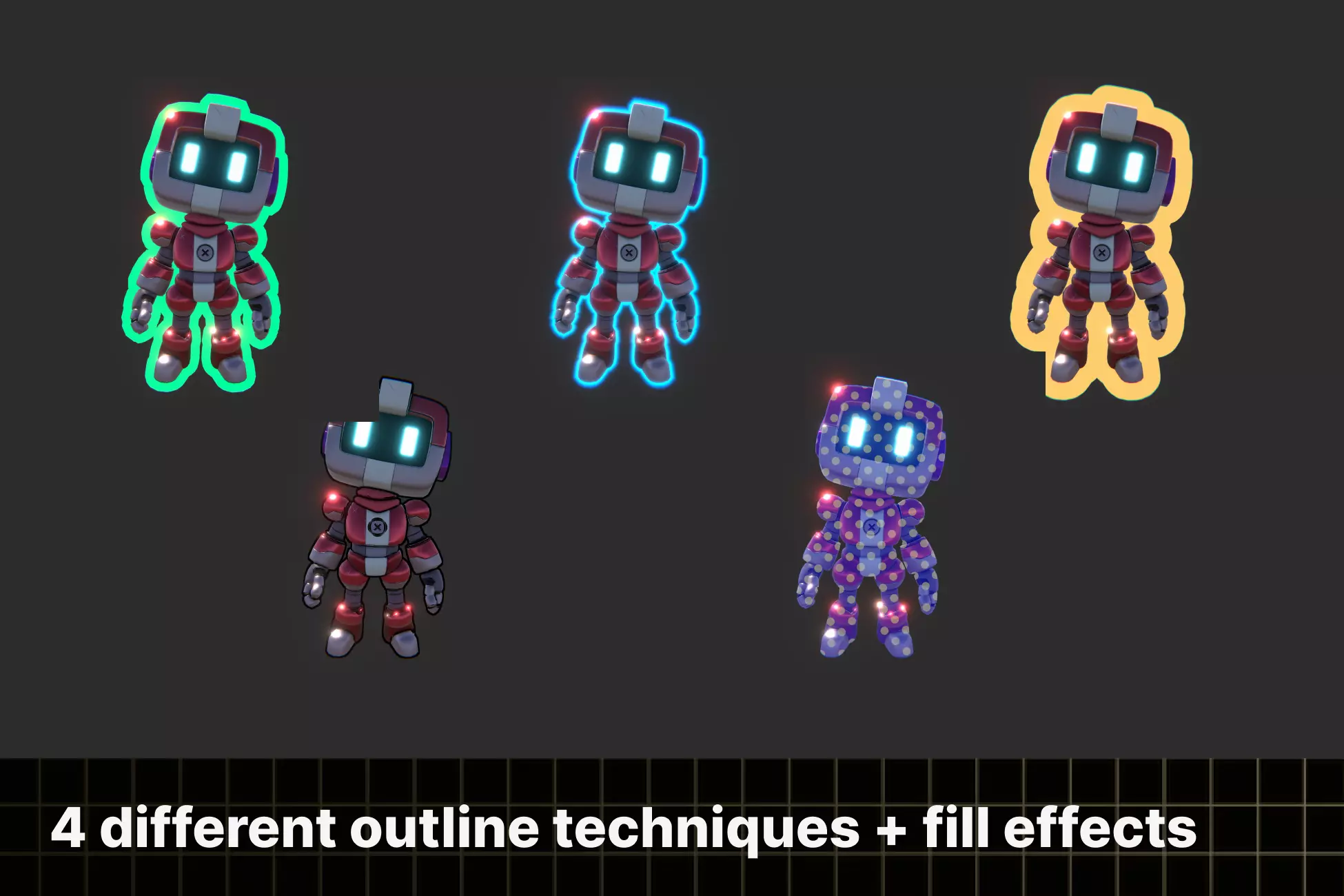 Includes fast, soft, and wide outline effects, as well as edge detection for full-scene outlines. Each method offers a balance between visual quality and performance, allowing you to choose the best fit for your project.