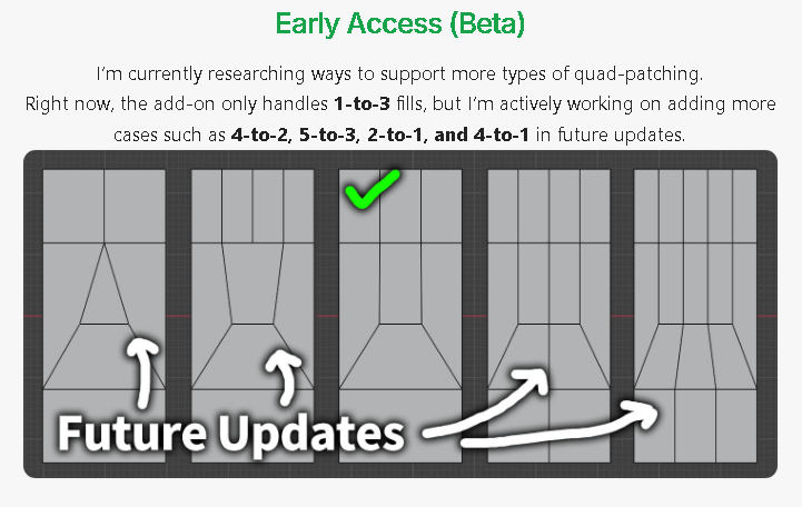 According to the developer Casey Sheep, several improvements are already in development. In the near future, the add-on will support additional quad-patching configurations beyond the current 3-to-1 setup, expanding to more complex fill patterns. The author also mentioned plans to enhance overall stability and extend compatibility for irregular topology cases.