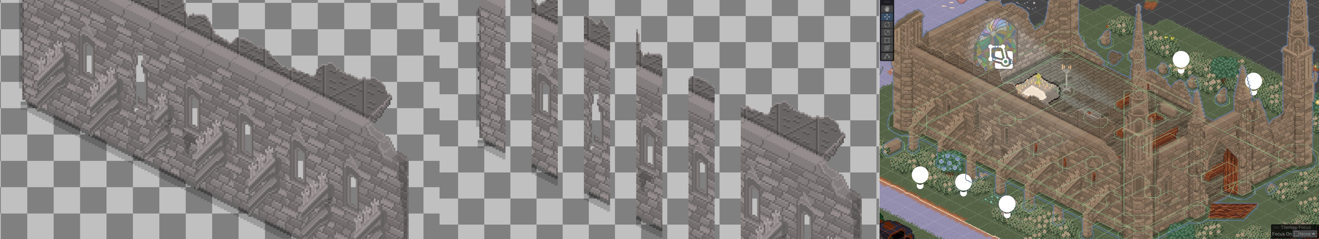 One of the trickiest parts comes from working with tiles. Even when drawing elements like roofs that sit above the base, everything still needs to stay within tile boundaries so Unity can sort it correctly.