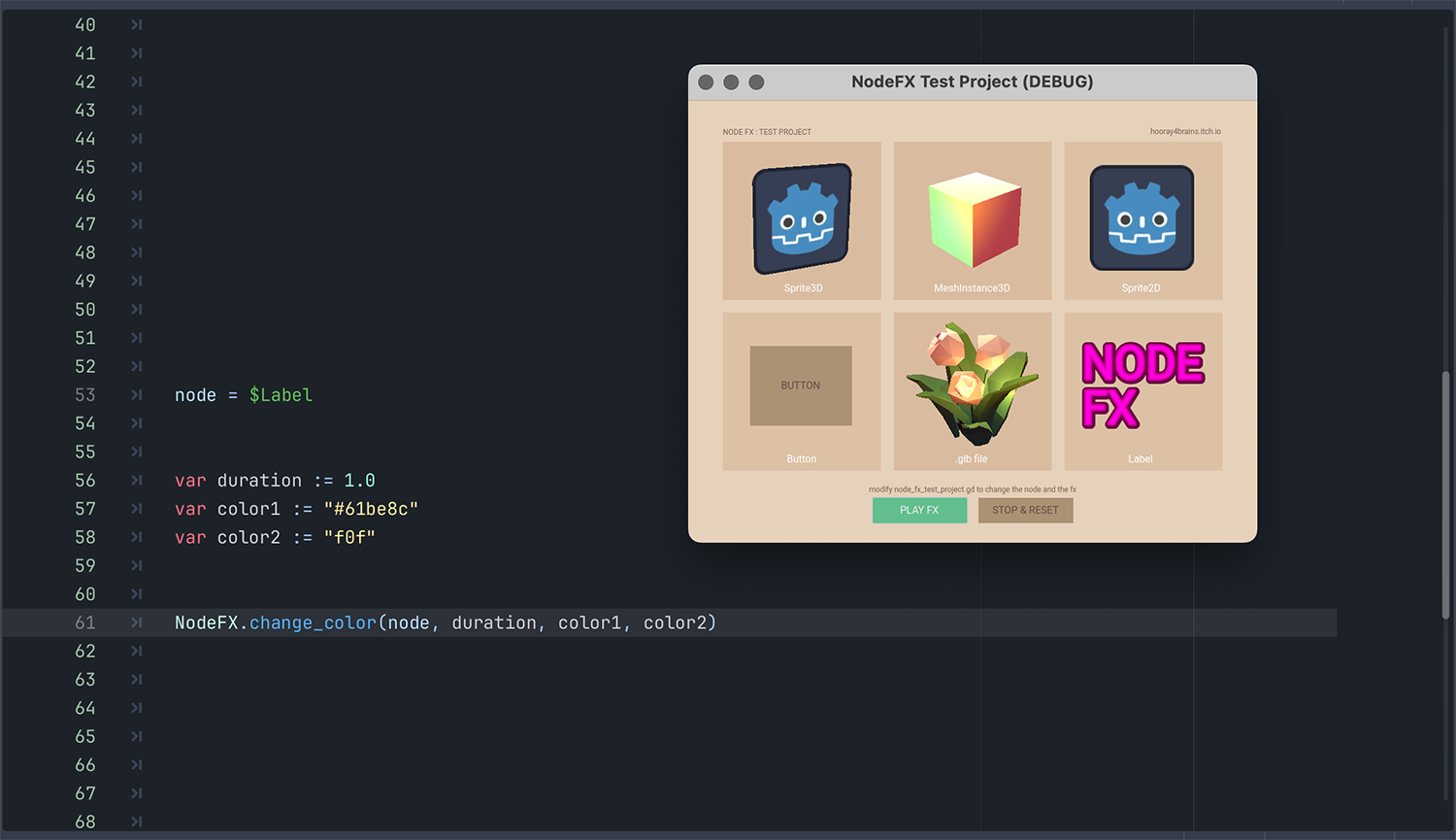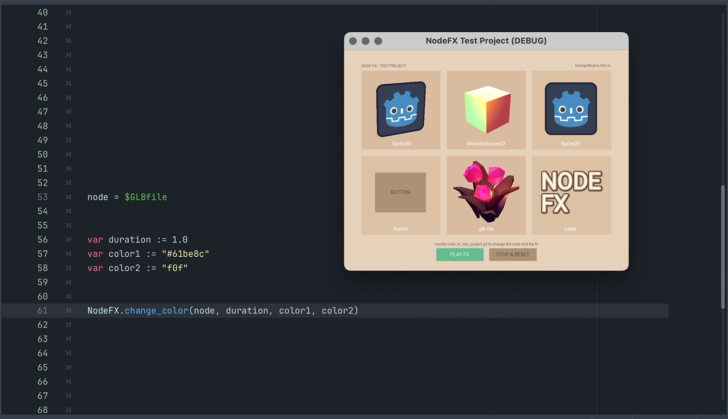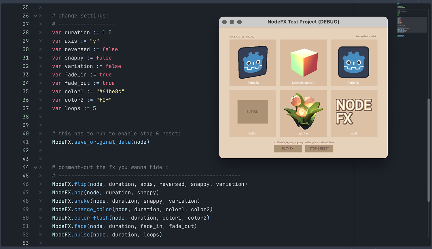 Node FX is an early-stage GDScript library that explores a simple idea: triggering common procedural animations on 3D, 2D, and UI nodes using a single line of code. The project is currently shared as a work in progress, with a live demo available to test the approach and gather feedback from the community.