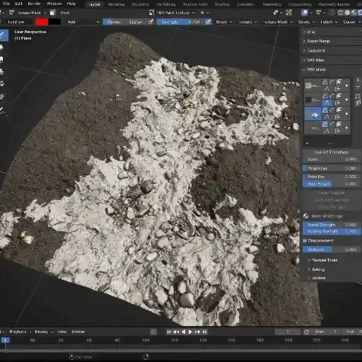With Paint Masks, height can be raised or lowered manually using Blender’s texture painting tools. Paint maps are created automatically and managed through the PBR Mixer panel.