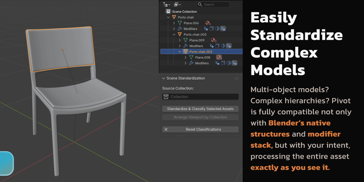 Pivot targets a very specific pain point in Blender workflows: assets that look correct visually but behave incorrectly when transformed. This usually comes down to misaligned local axes, misplaced origins, or inconsistent orientation across a group of objects.