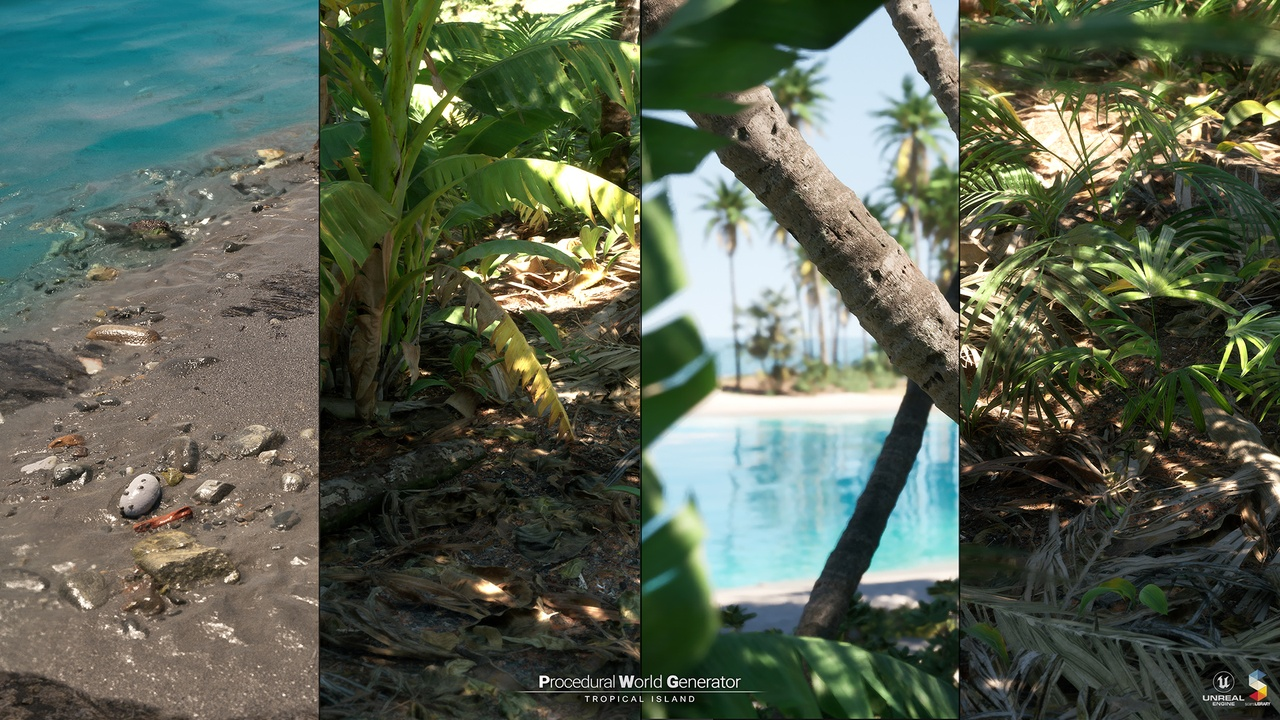 The result is a toolkit designed to generate forests, tropical islands, arid biomes, and more, directly inside UE5 using procedural volumes and Landscape Layers.