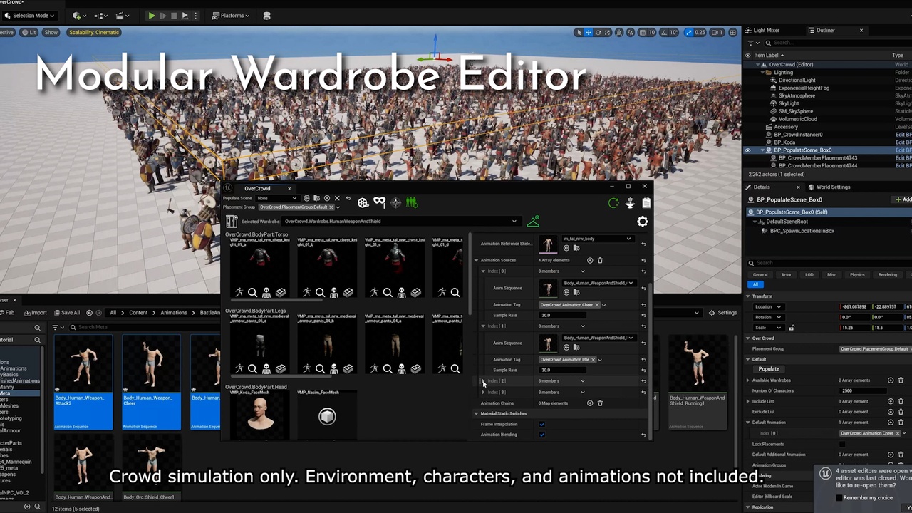 By combining Niagara with Vertex Animation Textures (VATs), OverCrowd can generate large, dynamic scenes, from battlefields to city streets, with minimal setup. It focuses on scalability and efficiency, enabling cinematic crowd shots directly in Unreal without relying on external simulation tools.
