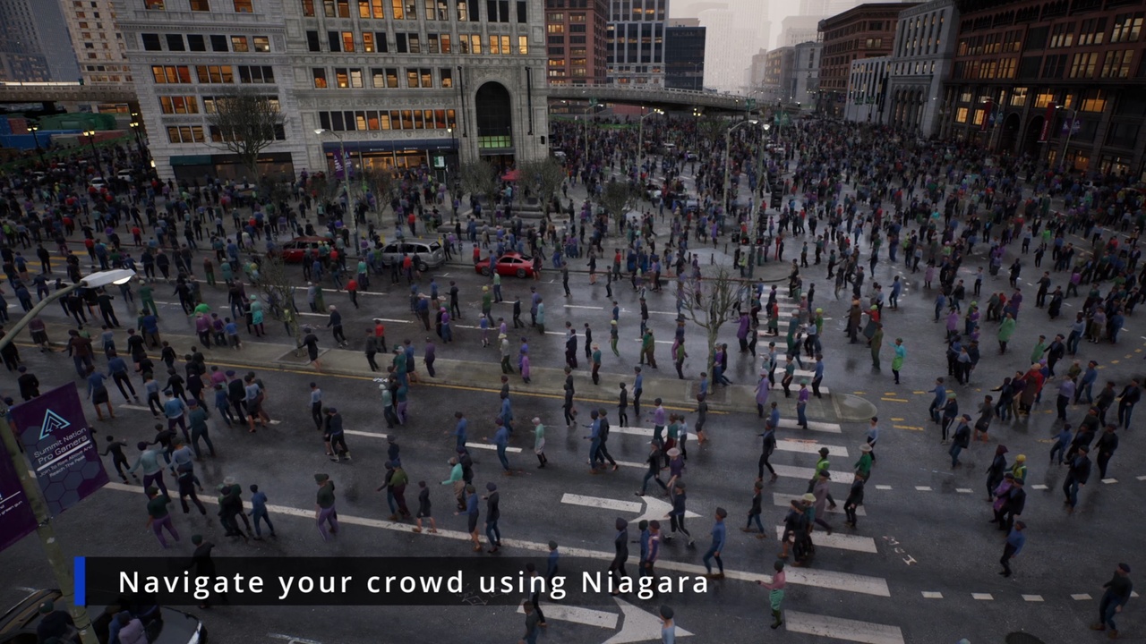Use Niagara systems to drive large-scale crowd behavior. Includes spline-following paths, grid-based positioning, and collision avoidance to keep characters moving naturally within complex scenes.