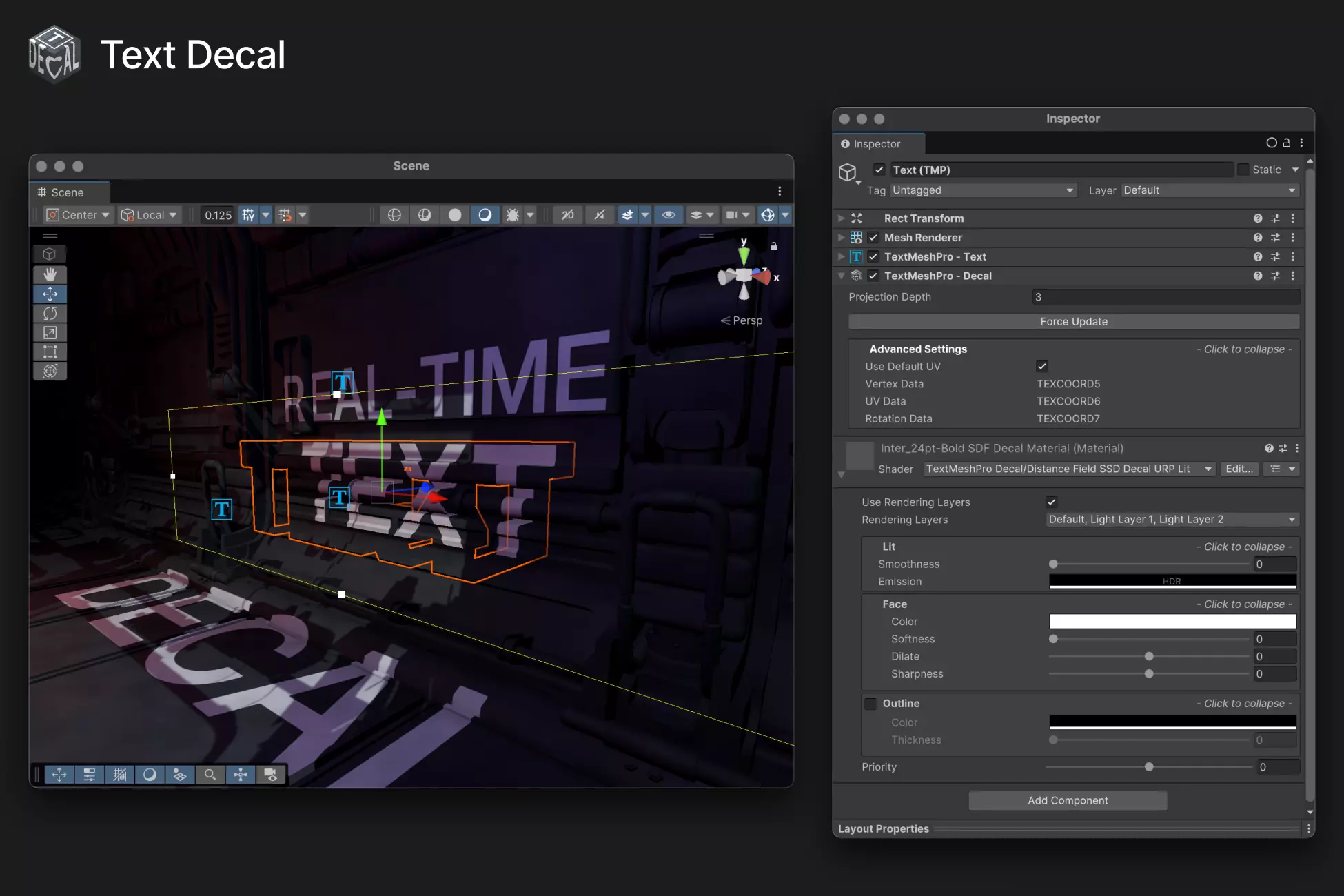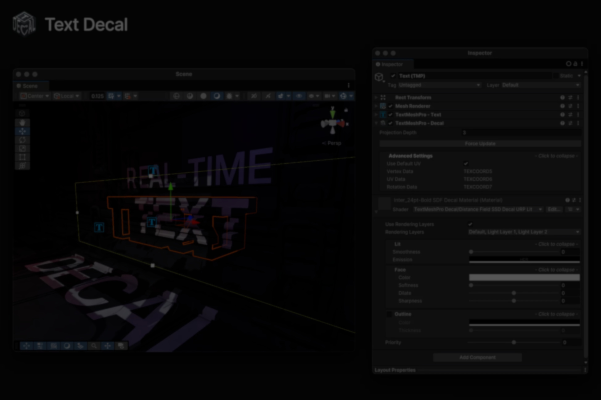 The result is a system where TextMesh Pro content is rendered through a decal projector, allowing text to wrap onto 3D geometry without manual UV work or baking.
