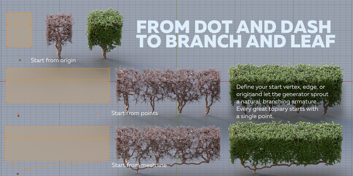 The generator includes optional trunk and branch growth based on simple mesh cues. Depending on how the input geometry is constructed, growth can originate from a single point, an edge, or the object’s origin.