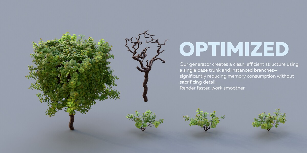 From a technical perspective, the generator relies heavily on instancing. Branches and leaves are not unique meshes, which keeps memory usage low even at higher densities.