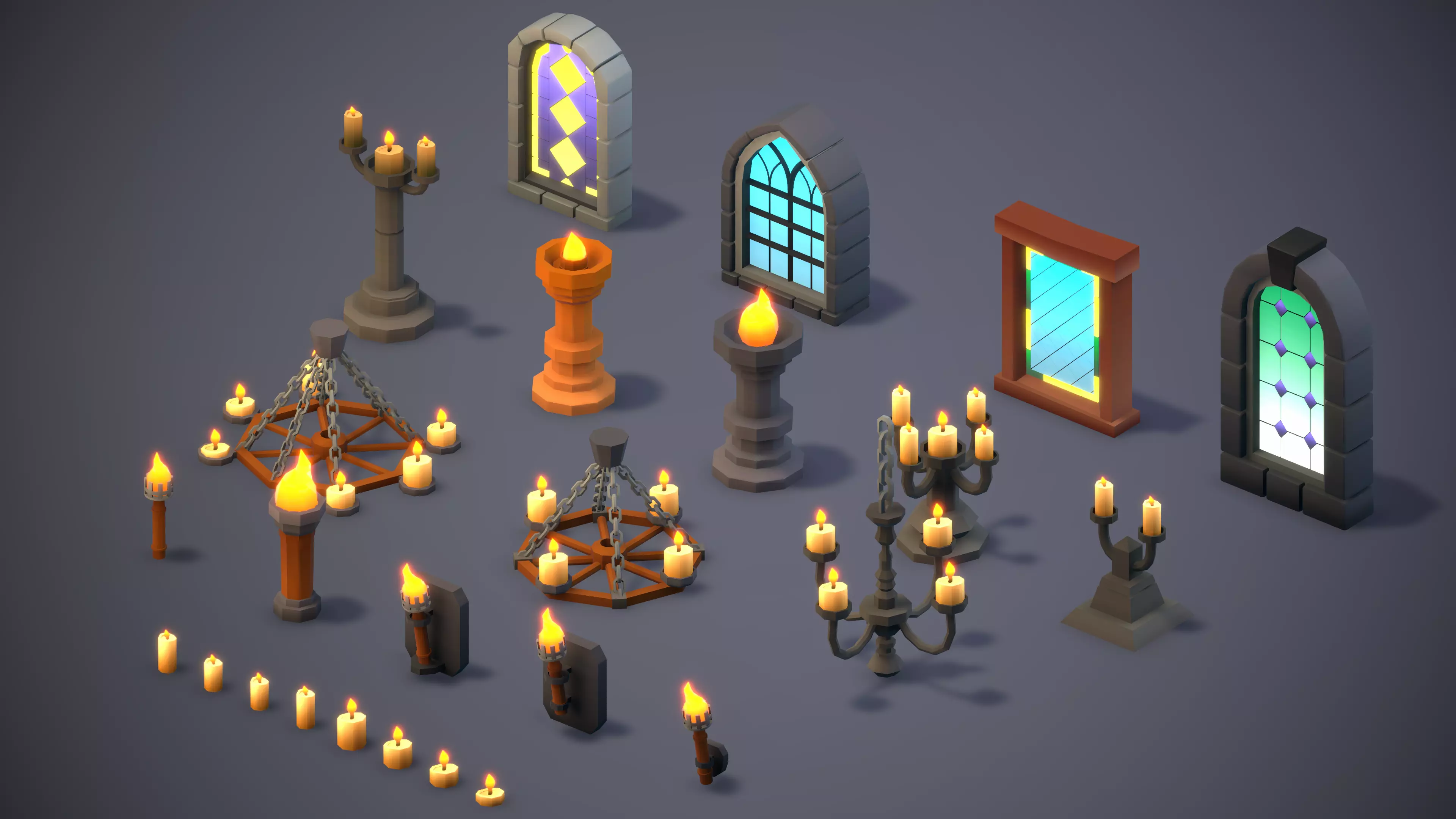 Alongside the structural pieces, the pack includes a broad set of props: furniture, barrels, chests, banners, candles, chandeliers, chains, carpets, torches, treasure parts, and other typical medieval interior assets.