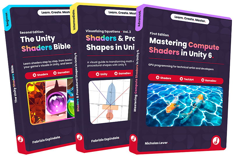 Note: The Unity Shaders Bible (2nd Edition) and Mastering Compute Shaders in Unity 6 are currently in development and will be published chapter by chapter, with Chapter 1 available at the moment for each. By purchasing now, you'll receive all future updates for free until the books are complete. (Learn more about our publishing process here).