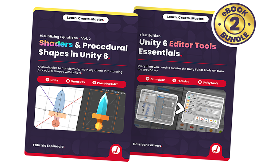 Designed for Unity developers who want to create both stunning visuals and powerful tools, this bundle brings together Shaders & Procedural Shapes in Unity 6 and Unity 6 Editor Tools Essentials - Vol 1 to offer a complete introduction to technical art and custom editor development. You’ll start by learning how to generate procedural shapes using polynomial and trigonometric functions, build 2D and 3D effects with HLSL and Shader Graph, and explore concepts like Signed Distance Functions and ray marching. Then, shift your focus to editor scripting as you create custom inspectors, property drawers, and editor windows using Unity’s modern UI Toolkit. With step-by-step examples, practical use cases, and a focus on real-world production workflows, this bundle equips you to elevate both the visual and functional sides of your Unity projects.