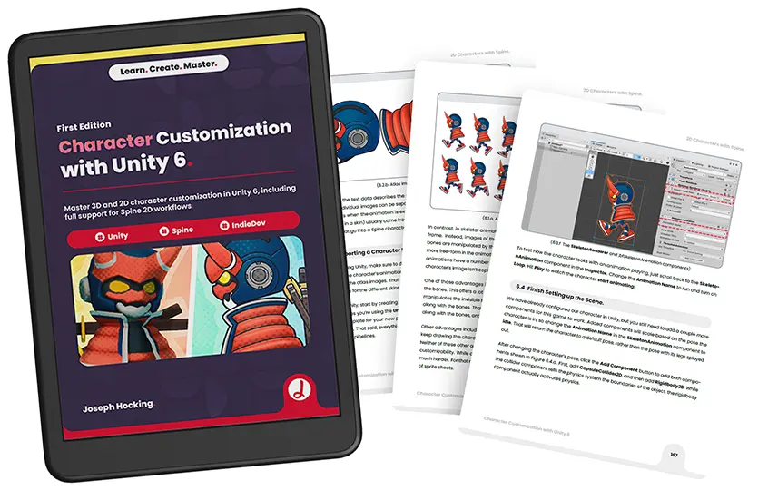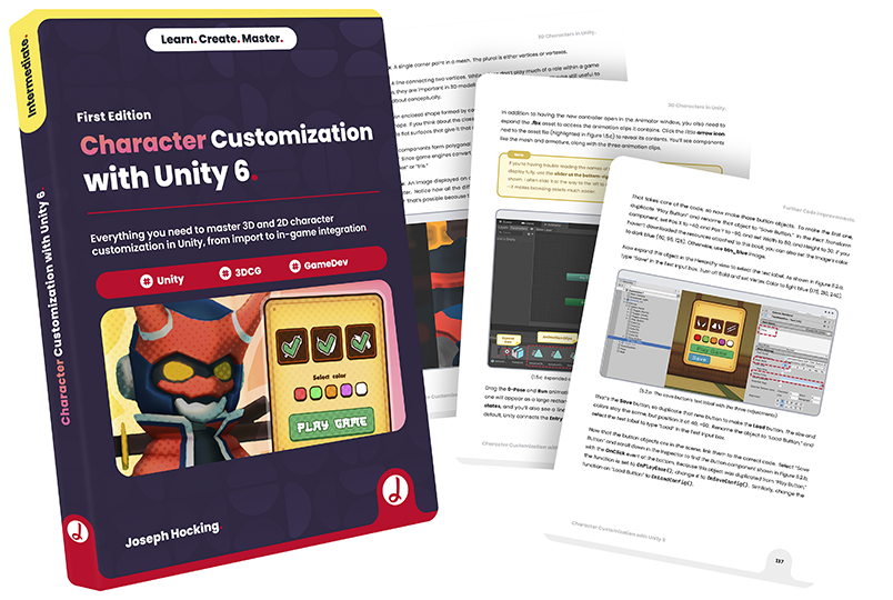 Designed for Unity developers working on both 2D and 3D projects, Character Customization with Unity 6 is a complete guide to building scalable and flexible character customization systems — from scratch. You’ll start by learning how to modify 3D models, materials, and textures in real time, then build an intuitive customization UI and integrate your characters directly into gameplay. The book also covers saving player data, applying decals, acquiring new skins, and using shaders to enhance visual variety. For 2D games, you'll explore how to work with Spine animations, swap body parts, and customize character colors on the fly. With practical, step-by-step instructions and a modular structure, this book ensures that whether you're creating stylized RPG avatars or animated 2D heroes, you'll have the tools needed to implement robust customization systems in Unity.