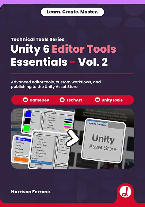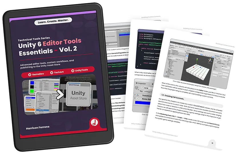 Expanding on the foundations of tool development, Unity 6 Editor Tools Essentials Vol. 2 takes your skills to a professional level by mastering advanced Editor APIs and modern workflows. You’ll begin by building complex C# controls and bindable elements within the UI Toolkit, moving beyond static layouts into dynamic, data-driven interfaces like TreeViews. As you advance, you’ll learn to bridge the gap between code and the viewport by creating custom Gizmos and interactive Handles for the Scene View. This volume also dives deep into the Asset Pipeline, teaching you to automate workflows with AssetPostprocessors and custom file importers. Then you'll finish up by architecting your own node-based tools using the new Graph Toolkit, and then taking the final steps of packaging and publishing your work to the Unity Asset Store. Combined with Vol. 1, this book provides the advanced technical knowledge needed to create robust editor extensions, whether for internal production tooling, or commercial distribution.